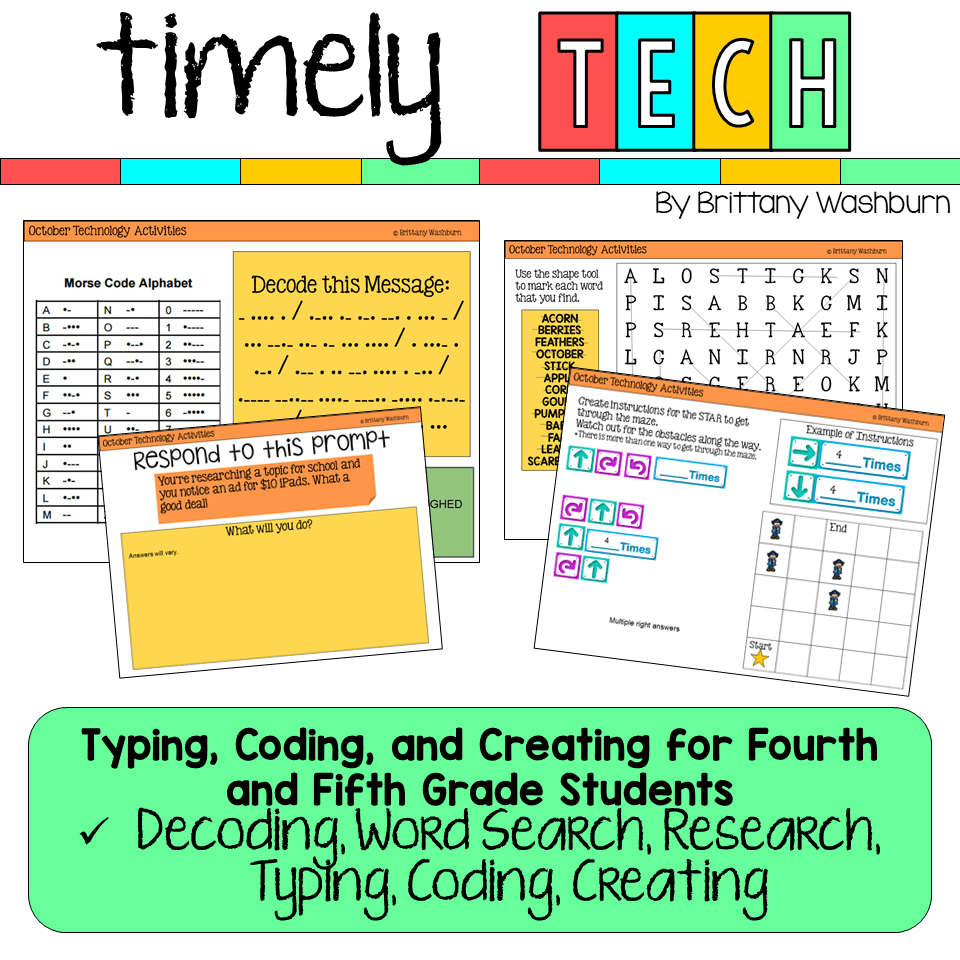 For the main activity for October in 3rd grade, students work through the slides in Timely Tech. They work on alphabetizing, they make new words out of the October themed words, respond to a typing prompt, and use the shape tools to design a scarecrow.