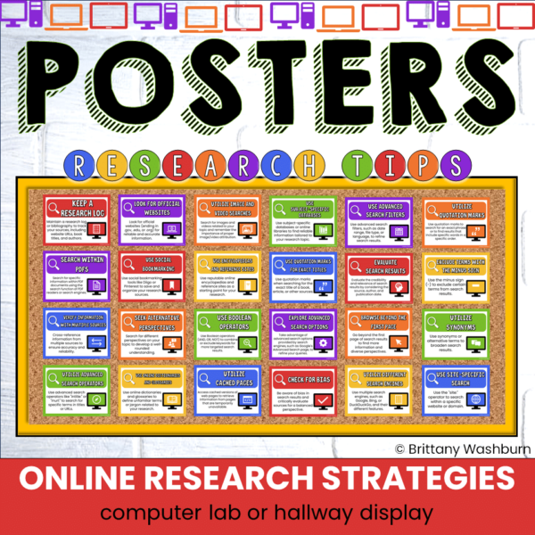 Teach and review online research skills strategies with this set of 25 posters that can be used as a bulletin board or display. Stylish yet academic posters, with both color and black and white options. Just print and set up!