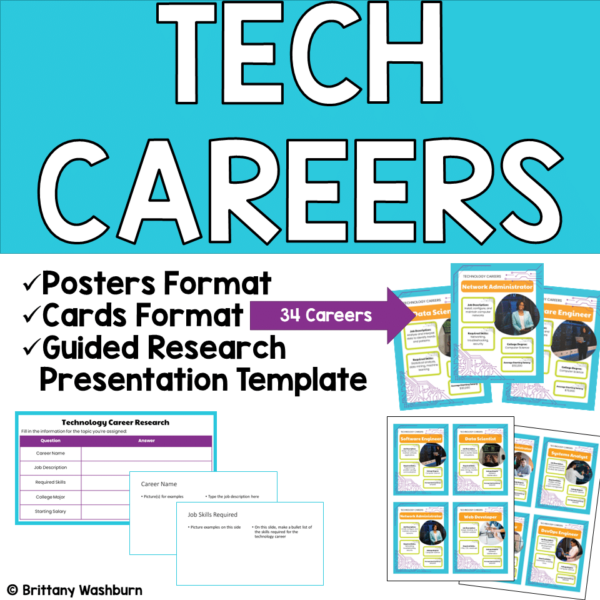 Unlock the world of technology careers with a guided research project! Perfect for grades 4-6, this interactive digital download is designed to inspire young minds and develop vital research and presentation skills. Discover the exciting world of technology and set your students on a path to success with this Tech Careers Guided Research Project. 34 Tech Career Posters provided with all of the facts students need to complete their presentation.