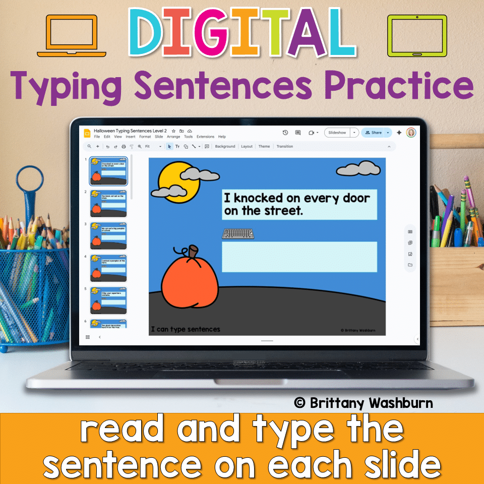 Looking for a fun and festive way to build typing fluency with your primary students? This Halloween-themed typing activity includes 40 digital slides, each featuring a short, age-appropriate sentence that students can type directly on the screen. Whether you’re working on keyboarding skills or want an engaging October tech activity, this resource is a spooktacular addition to your lesson plans!
