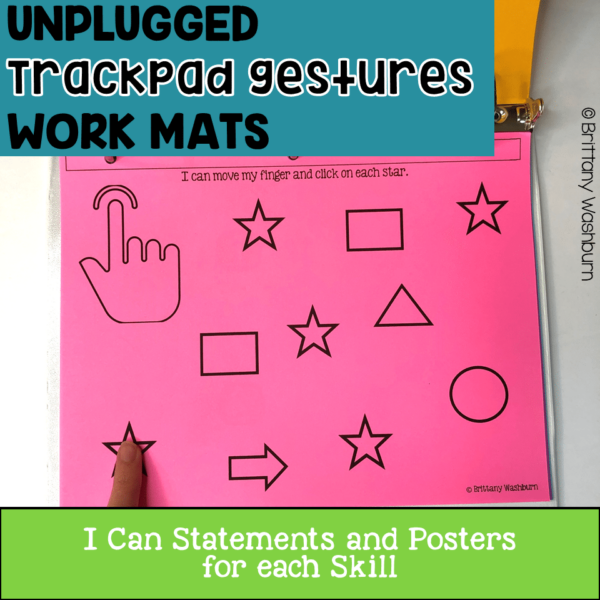 40 pages of unplugged trackpad gesture practice! Students practice moving, clicking, swiping, scrolling, right-clicking, and clicking and dragging on paper work mats before they even get on a computer. Great for Chromebook users!